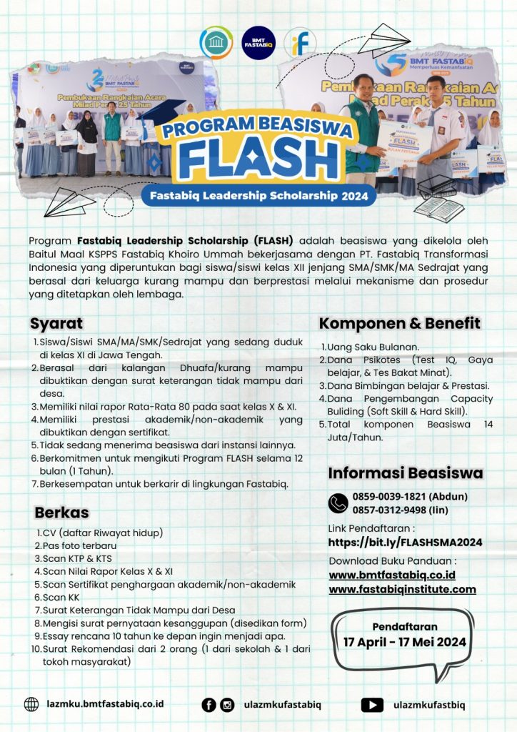 Program Fastabiq Leadership Scholarship (FLASH) adalah beasiswa yang dikelola oleh Baitul Maal KSPPS Fastabiq Khoiro Ummah bekerjasama dengan PT. Fastabiq Transformasi Indonesia yang diperuntukan bagi siswa /siswi SMA/SMK/MA Sederajat Kelas XII di Jawa Tengah dan berasal dari keluarga kurang mampu.